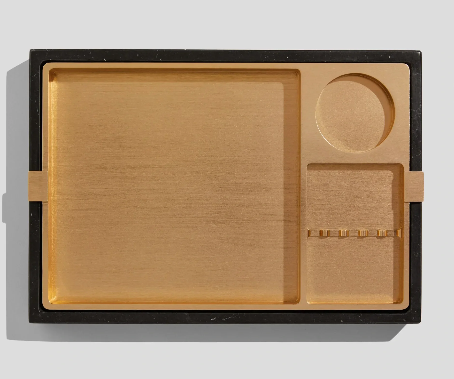 inspired by artist richard serra’s monumental sculptures, the serra rolling tray is carved from a single block of italian marble, with a removable metal insert for rolling and organizing. available in arabescato vagli, verde guatemala, and nero marquina marble, with brass or silver inserts, it doubles as a coffee table centerpiece. priced at $2,000, it’s less of a tool and more of a collectible.